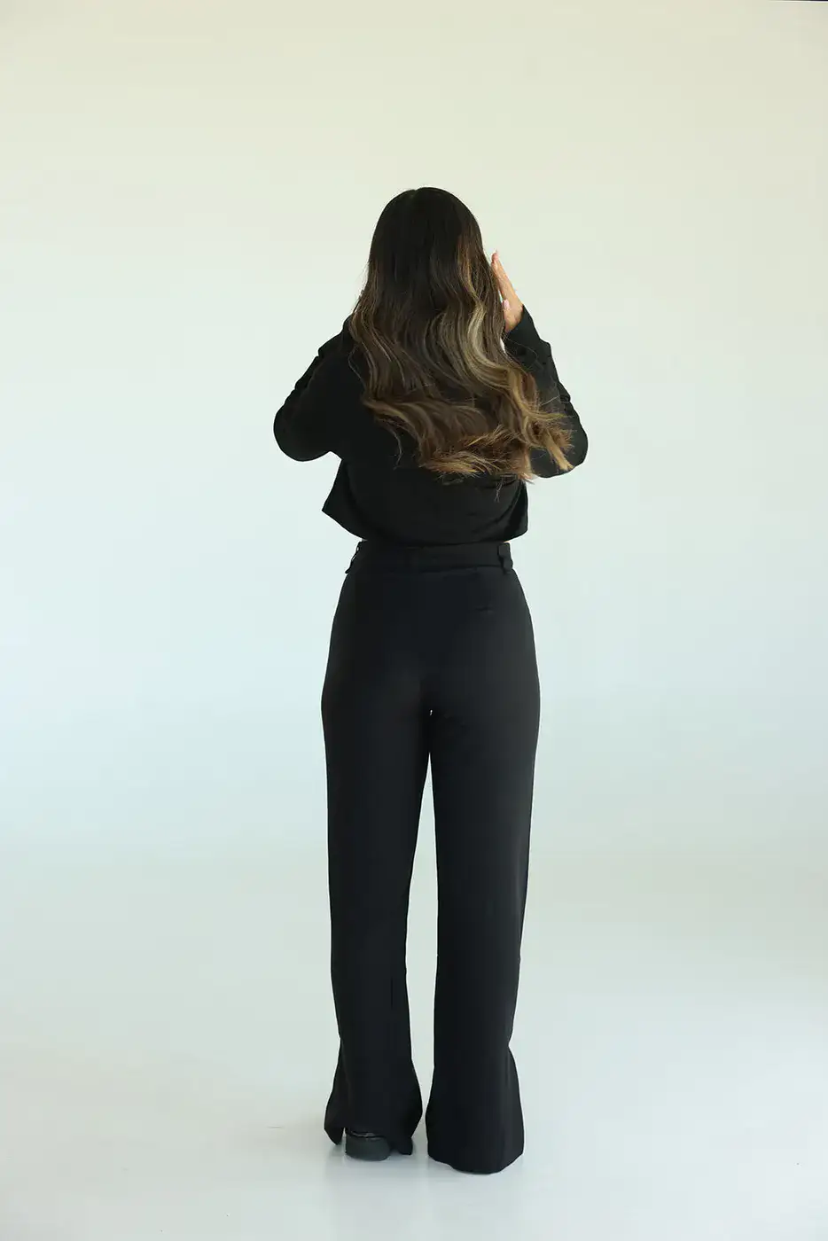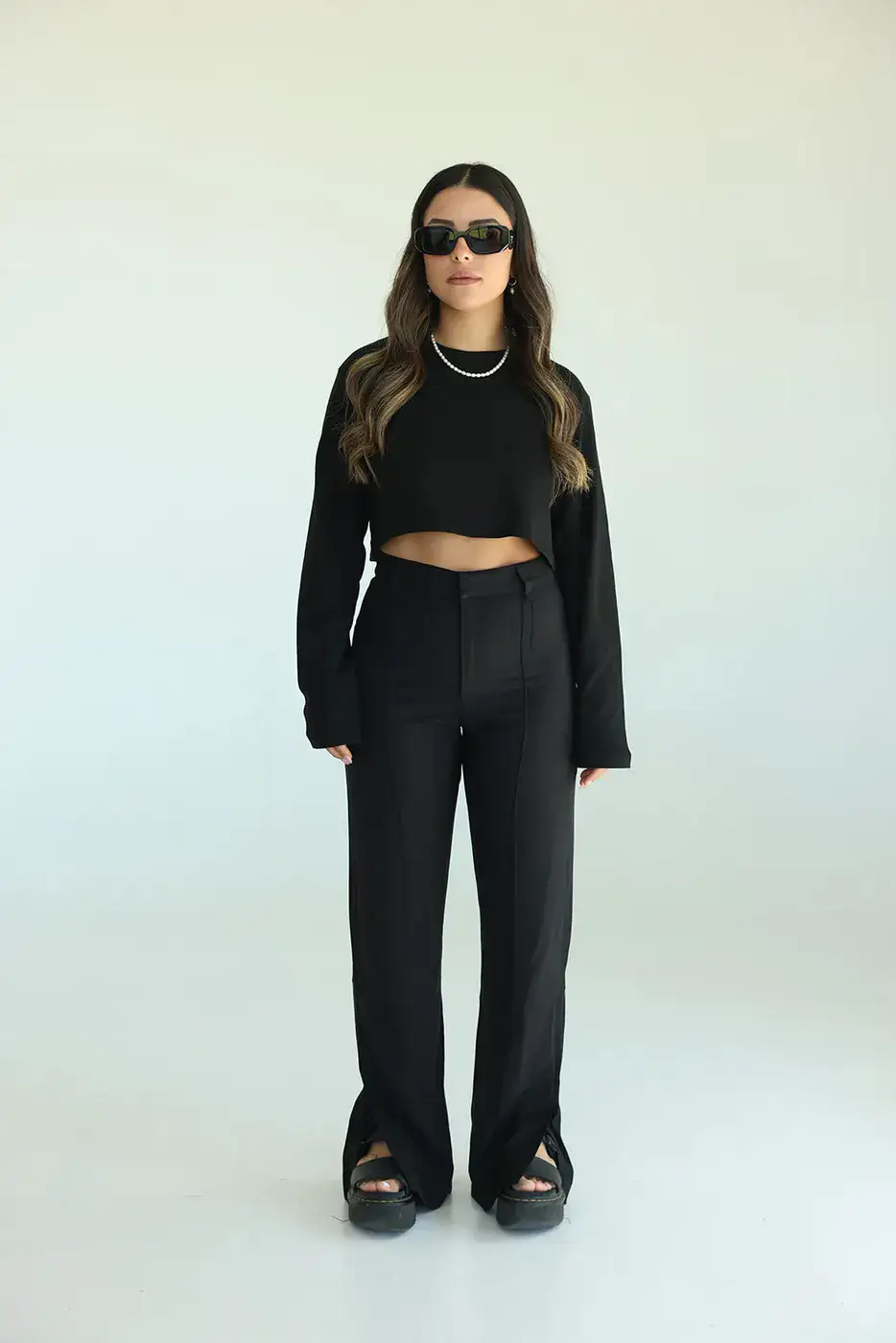מכנס ארוך בגזרה צמודה ומחויטת עם שסעים בצידי המכנסיים