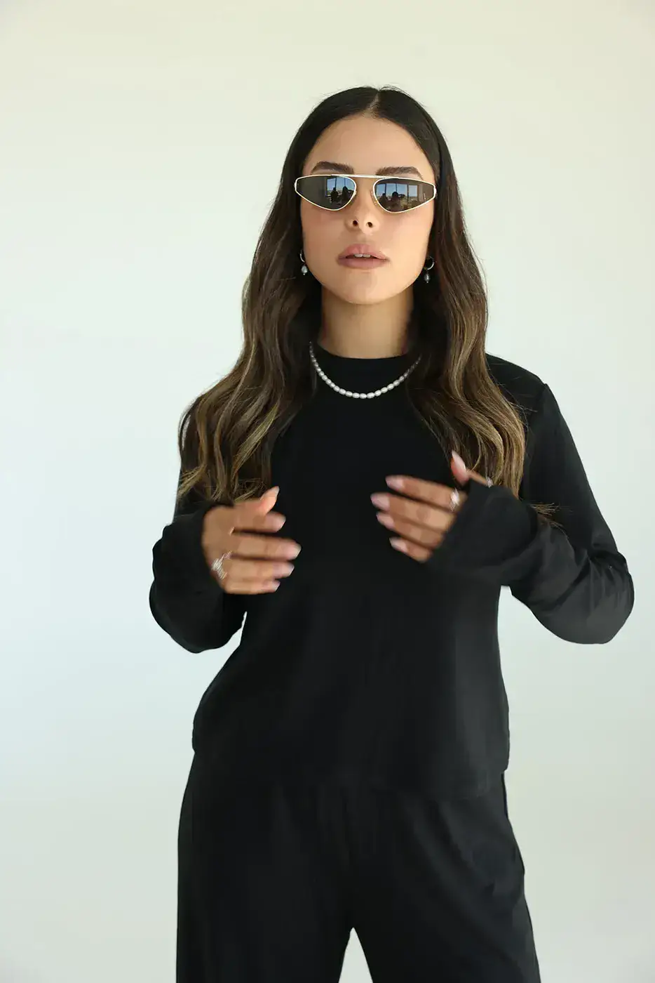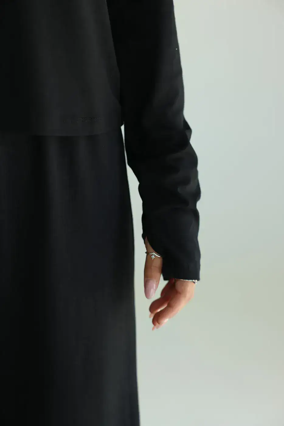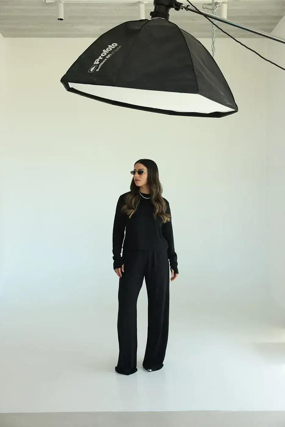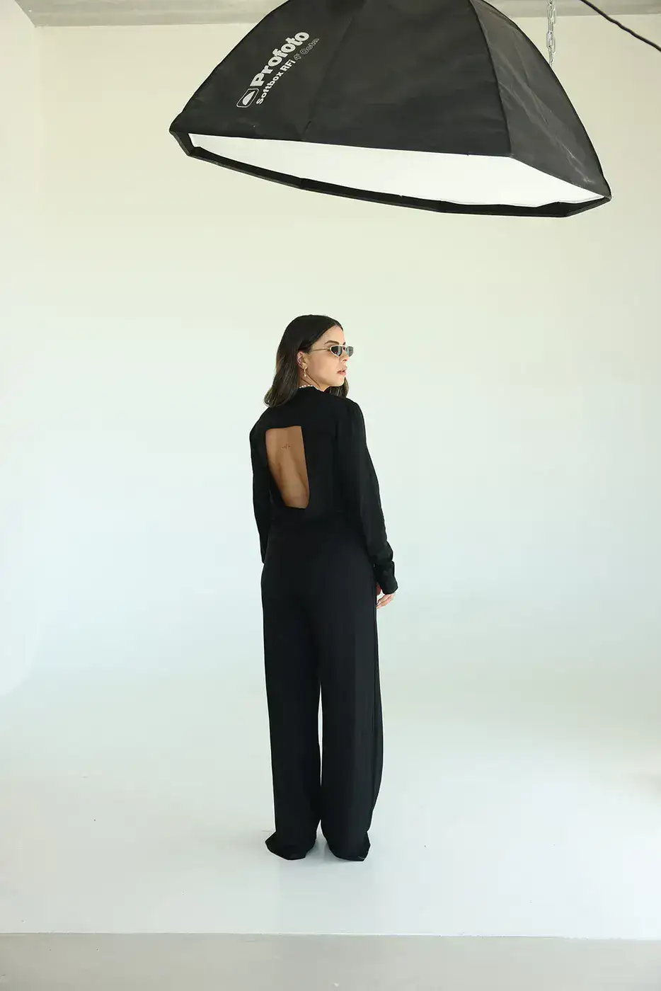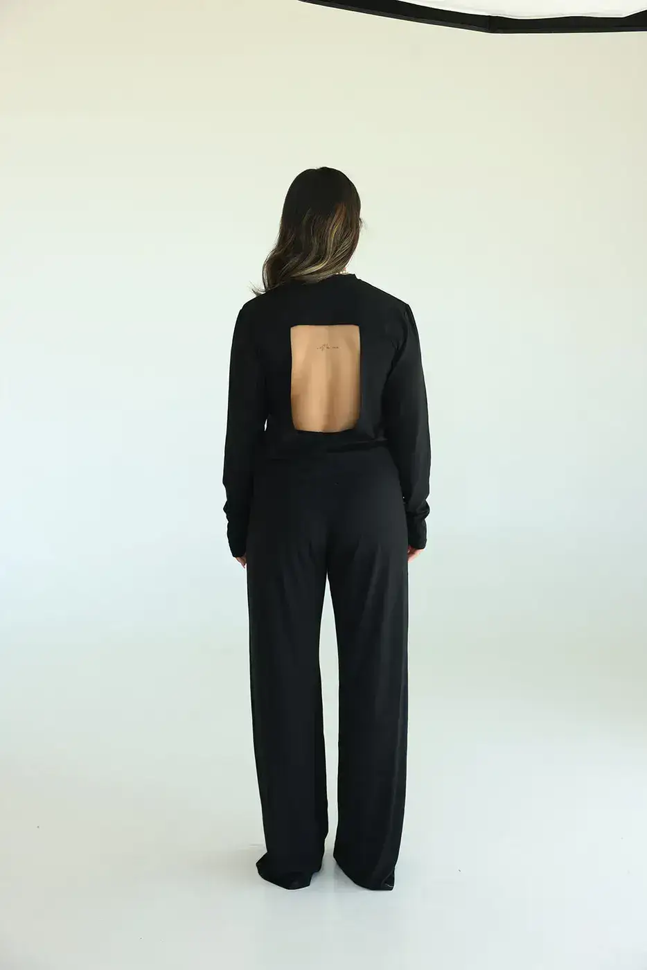 |מכנסיים ארוכים נשפכים| חולצה עם מפתח עמוק בגב ופתח באגודל