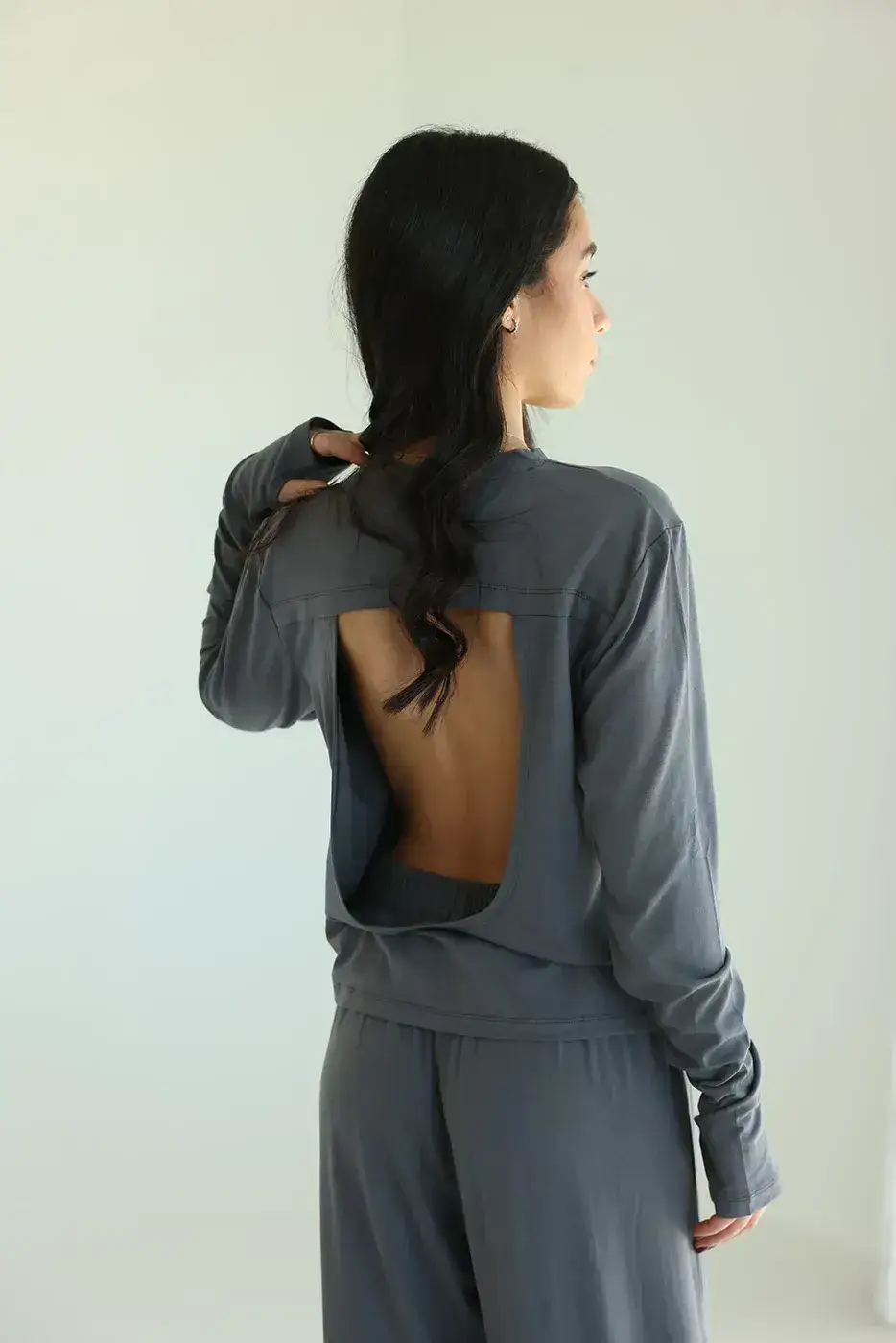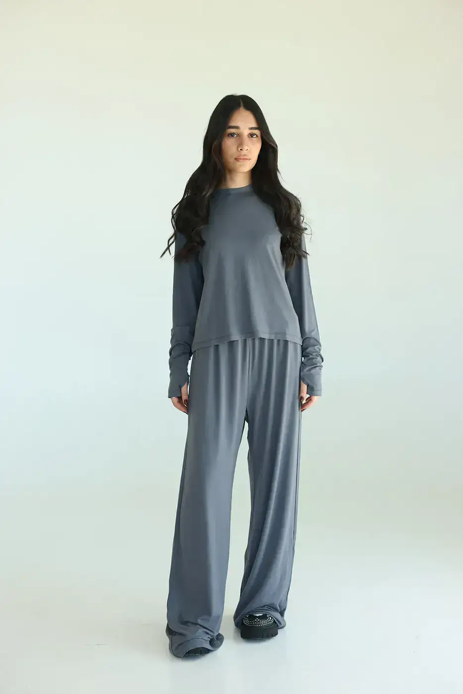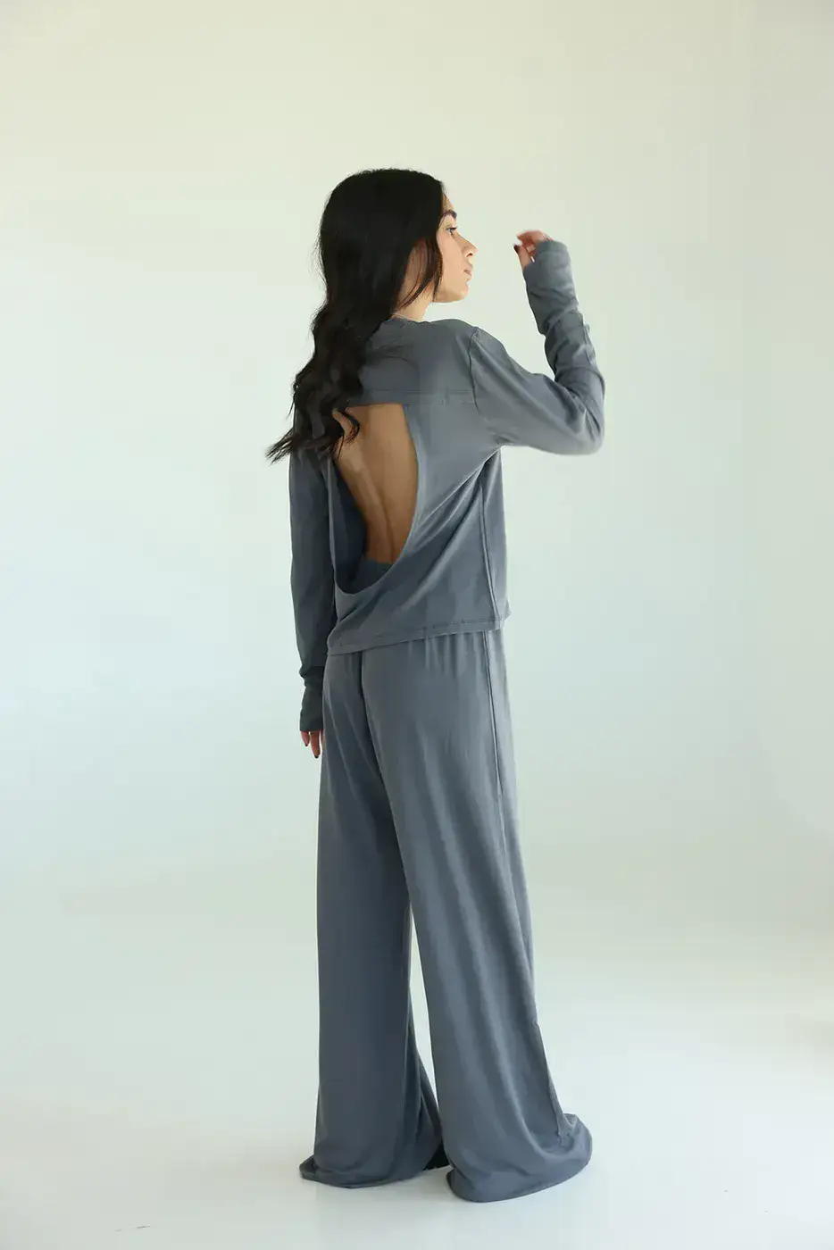 |מכנסיים ארוכים נשפכים| חולצה עם מפתח עמוק בגב ופתח באגודל